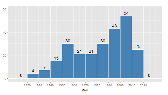 Refinamos y personalizamos el histograma para conocer exactamente el número de películas por década.